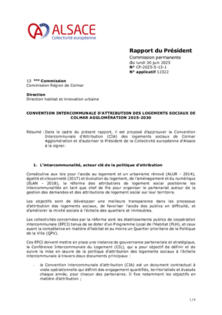 Dans le cadre du présent rapport, il est proposé d’approuver la Convention Intercommunale d’Attribution (CIA) des logements sociaux de Colmar Agglomération et d’autoriser le Président de la Collectivité européenne d’Alsace à la signer.
