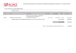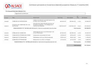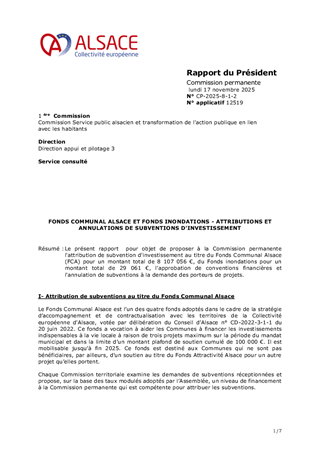 Le présent rapport pour objet de proposer à la Commission permanente l'attribution de subvention d'investissement au titre du Fonds Communal Alsace (FCA) pour un montant total de 8 107 056 €, du Fonds inondations pour un montant total de 29 061 €, l'approbation de conventions financières et l'annulation de subventions à la demande des porteurs de projets.
