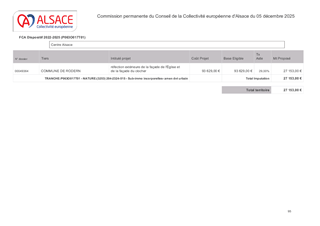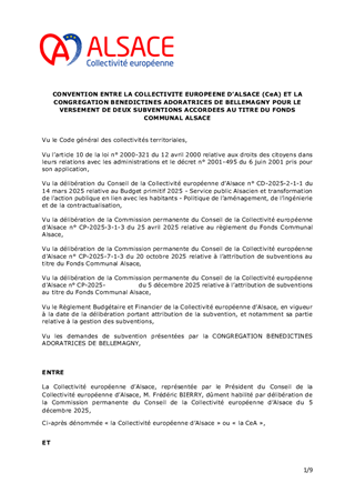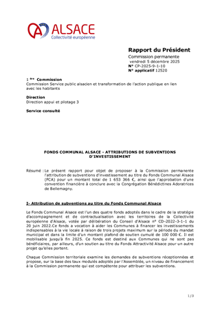 Le présent rapport pour objet de proposer à la Commission permanente l'attribution de subventions d'investissement au titre du Fonds Communal Alsace (FCA) pour un montant total de 1 653 366 €, ainsi que l'approbation d'une convention financière à conclure avec la Congrégation Bénédictines Adoratrices de Bellemagny.