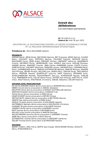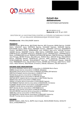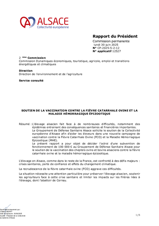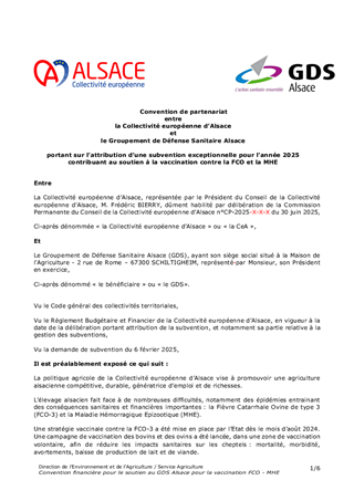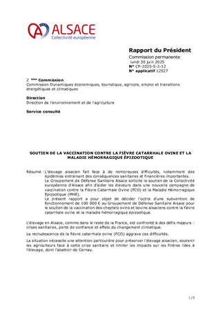 L’élevage alsacien fait face à de nombreuses difficultés, notamment des épidémies entrainant des conséquences sanitaires et financières importantes. Le Groupement de Défense Sanitaire Alsace sollicite le soutien de la Collectivité européenne d'Alsace afin d’aider les éleveurs dans une nouvelle campagne de vaccination contre la Fièvre Catarrhale Ovine (FCO) et la Maladie Hémorragique Epizootique (MHE). Le présent rapport a pour objet de décider l'octroi d'une subvention de fonctionnement de 100 000 € au Groupement de Défense Sanitaire Alsace pour le soutien de la vaccination des cheptels ovins et bovins alsaciens contre la fièvre catarrhale ovine et la maladie hémorragique épizootique.