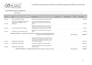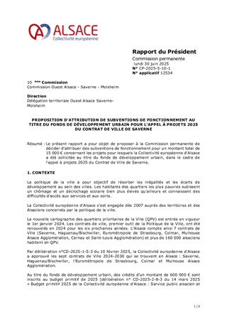 Le présent rapport a pour objet de proposer à la Commission permanente de décider d’attribuer des subventions de fonctionnement pour un montant total de 15 000 € concernant les projets pour lesquels la Collectivité européenne d'Alsace a été sollicitée au titre du fonds de développement urbain, dans le cadre de l'appel à projets 2025 du Contrat de Ville de Saverne.