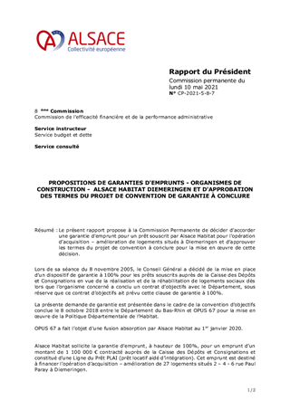 Le présent rapport propose à la Commission Permanente de décider d’accorder une garantie d’emprunt pour un prêt souscrit par Alsace Habitat pour l’opération d’acquisition – amélioration de logements situés à Diemeringen et d’approuver les termes du projet de convention à conclure pour la mise en œuvre de cette décision.