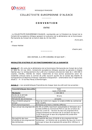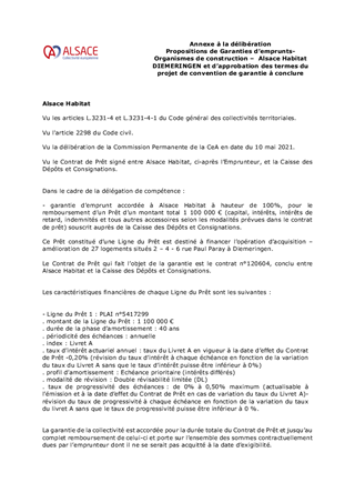 PROPOSITIONS DE GARANTIES D'EMPRUNTS - ORGANISMES DE CONSTRUCTION -ALSACE HABITAT DIEMERINGEN ET D'APPROBATION DES TERMES DU PROJET DE CONVENTION DE GARANTIE À CONCLURE