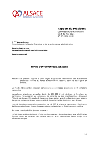 Le présent rapport a pour objet d'approuver l'attribution des subventions proposées au titre du Fonds d'Intervention Alsacien, selon le détail joint en annexe.