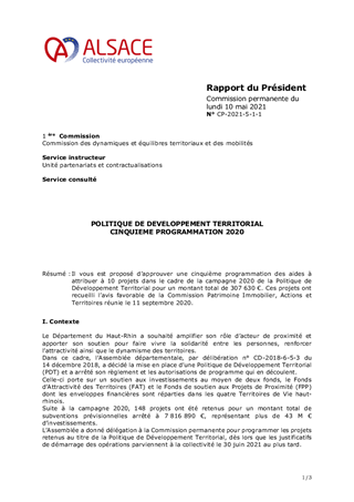 Il vous est proposé d’approuver une cinquième programmation des aides à attribuer à 10 projets dans le cadre de la campagne 2020 de la Politique de Développement Territorial pour un montant total de 307 630 €. Ces projets ont recueilli l’avis favorable de la Commission Patrimoine Immobilier, Actions et Territoires réunie le 11 septembre 2020.