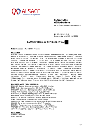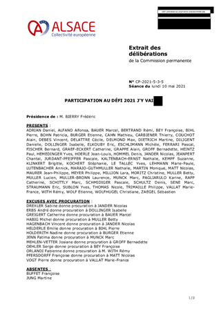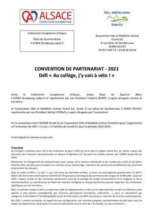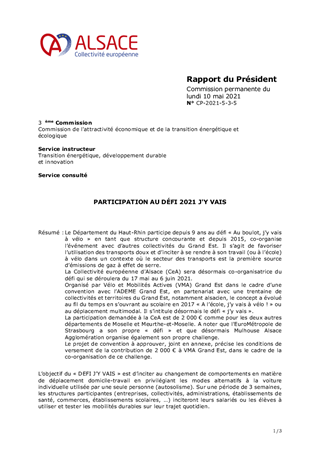 Le Département du Haut-Rhin participe depuis 9 ans au défi « Au boulot, j’y vais à vélo » en tant que structure concourante et depuis 2015, co-organise l’événement avec d’autres collectivités du Grand Est. Il s’agit de favoriser l’utilisation des transports doux et d’inciter à se rendre à son travail (ou à l’école) à vélo dans un contexte où le secteur des transports est la première source d’émissions de gaz à effet de serre. La Collectivité européenne d'Alsace (CeA) sera désormais co-organisatrice du défi qui se déroulera du 17 mai au 6 juin 2021. Organisé par Vélo et Mobilités Actives (VMA) Grand Est dans le cadre d’une convention avec l’ADEME Grand Est, en partenariat avec une trentaine de collectivités et territoires du Grand Est, notamment alsacien, le concept a évolué au fil du temps en s’ouvrant au scolaire en 2017 « A l’école, j’y vais à vélo ! » ou au déplacement multimodal. Il s’intitule désormais le défi « j’y vais ». La participation demandée à la CeA est de 2 000 € comme pour les deux autres départements de Moselle et Meurthe-et-Moselle. A noter que l'EuroMétropole de Strasbourg a son propre « défi » et que désormais Mulhouse Alsace Agglomération organise également son propre challenge. Le projet de convention à approuver, joint en annexe, précise les conditions de versement de la contribution de 2 000 € à VMA Grand Est, dans le cadre de la co-organisation de ce challenge.