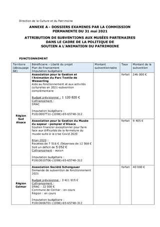 Au titre des politiques en faveur du patrimoine et de la mémoire, la Collectivité européenne d’Alsace soutient en fonctionnement l’animation du patrimoine et de la mémoire ainsi que l'investissement des musées partenaires. Il vous est proposé d’attribuer et d’autoriser le versement de subventions de fonctionnement en faveur de 6 musées et de 2 structures mémorielles pour un montant total de 661 405 € réparti de la manière suivante : - 246 000 € pour l’Association pour la Gestion et l'Animation du Parc Textile de Wesserling, - 240 000 € pour l’Association de l’Ecomusée d’Alsace à Ungersheim, - 7 000 € pour l'Association Groupe Rodolphe, concernant le carreau Rodolphe à Pulversheim, - 9 405 € pour le Musée du sapeur-pompier d'Alsace à Vieux-Ferrette, - 75 000 € pour l'Association Propriétaire du Musée National de l'Automobile de Mulhouse concernant la Cité de l'Automobile, - 40 000 € pour la société Schongauer concernant le Musée Unterlinden à Colmar, - 29 000 € pour le Comité du Monument national du Hartmannswillerkopf, - 15 000 € pour le Centre de Recherches sur l'Histoire des Familles (CRHF). Il vous est également proposé d’attribuer et d'autoriser le versement de subventions d'investissement en faveur de 2 musées pour un montant total de 350 000 € réparti de la manière suivante : - 100 000 € pour l’Association de Gestion et d’Animation du Parc Textile de Wesserling, - 250 000 € pour l’Association de l’Ecomusée d’Alsace à Ungersheim.