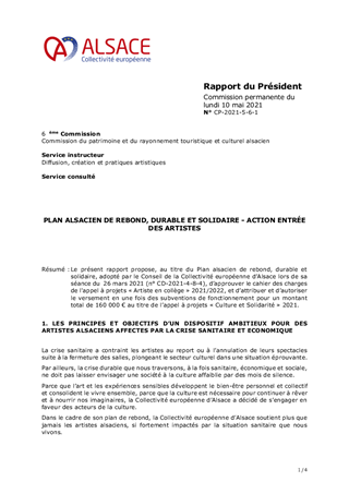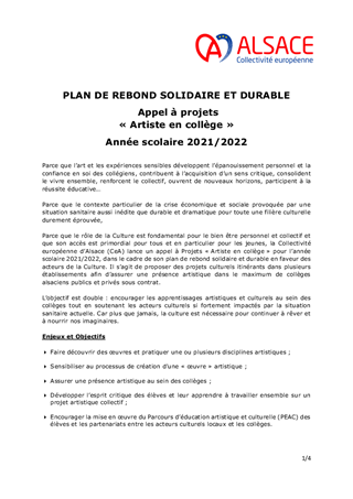 Le présent rapport propose, au titre du Plan alsacien de rebond, durable et solidaire, adopté par le Conseil de la Collectivité européenne d’Alsace lors de sa séance du 26 mars 2021 (n° CD-2021-4-8-4), d’approuver le cahier des charges de l'appel à projets « Artiste en collège » 2021/2022, et d’attribuer et d’autoriser le versement en une fois des subventions de fonctionnement pour un montant total de 160 000 € au titre de l’appel à projets « Culture et Solidarité » 2021.