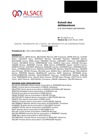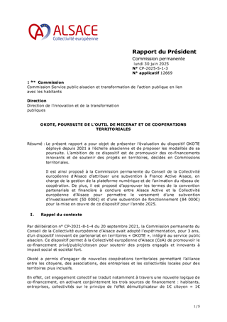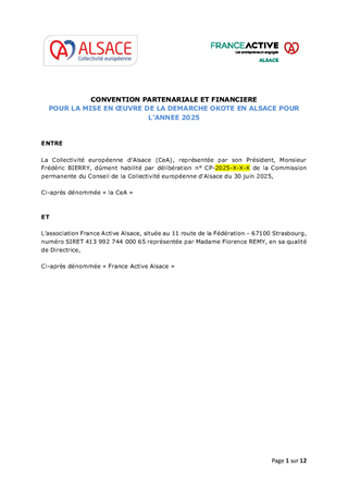 Le présent rapport a pour objet de présenter l’évaluation du dispositif OKOTE déployé depuis 2021 à l’échelle alsacienne et de proposer les modalités de sa poursuite. L’ambition de ce dispositif est de promouvoir des co-financements innovants et de soutenir des projets en territoires, décidés en Commissions territoriales. Il est ainsi proposé à la Commission permanente du Conseil de la Collectivité européenne d’Alsace d’attribuer une subvention à France Active Alsace, en charge de la gestion de la plateforme numérique et de l’animation du réseau de coopération. De plus, il est proposé d’approuver les termes de la convention partenariale et financière à conclure entre Alsace Active et la Collectivité européenne d’Alsace pour permettre le versement d’une subvention d’investissement (50 000€) et d’une subvention de fonctionnement (84 000€) pour la mise en œuvre de ce dispositif pour l'année 2025.