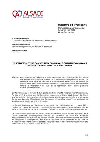 Conformément au code rural et de la pêche maritime, l’aménagement foncier est une compétence pleine et entière de la Collectivité européenne d’Alsace. Ce rapport a pour objet de proposer à la Commission permanente de décider de l’institution d’une Commission Communale ou Intercommunale d’Aménagement Foncier à WEITBRUCH en vue de la réalisation d’une étude préalable d’aménagement foncier.