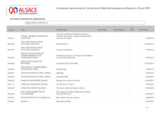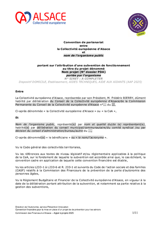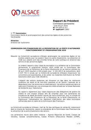 La Collectivité européenne d’Alsace accompagne les personnes âgées et les proches aidants pour les soutenir face à la perte d’autonomie. La prévention et l’aide aux aidants sont des priorités fortes de notre politique en direction des seniors et des personnes âgées. Le présent rapport a pour objet de soumettre à la validation de la Commission permanente le programme d'action 2025 arrêté par la Commission des Financeurs de la Prévention de la Perte d'Autonomie en sa réunion plénière du 28 avril 2025 (soutien à 418 projets pour 4 118 205 € de subventions, dont 4 037 751 € versés par la Collectivité européenne d'Alsace) d'approuver les conventions correspondantes, et de valider les modalités d'attribution du Forfait Autonomie 2025 (pour 935 109,80 €). L’objectif des actions soutenues est d’avancer en âge dans les meilleures conditions de santé et de bien-être possibles et de ralentir l’avancée de la dépendance pour les personnes en établissement. Les actions soutenues dans ce cadre sont financées par une enveloppe de crédits alloués par la Caisse Nationale de Solidarité pour l’Autonomie. Ce rapport a également pour objet d’approuver des délégations de gestion de crédits et une mission d’appui afin de simplifier pour nos partenaires les procédures de dépôt de dossier auprès de notre Collectivité, pour le compte de la Commission des Financeurs de la Prévention de la Perte d’Autonomie, et d’approuver l’actualisation du règlement d’attribution des aides techniques cofinancées dans le cadre de la Commission des Financeurs.