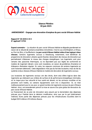 Le présent rapport a pour objet de proposer à l'Assemblée de la Collectivité européenne d’Alsace d'adopter la décision modificative n°1 (budget supplémentaire) de l’exercice 2025 par l’affectation définitive du résultat 2024, ainsi que par l’adoption de nouvelles inscriptions budgétaires pour le budget principal et les budgets annexes. Pour rappel, l’élaboration du budget 2025 s’est inscrit dans un contexte de forte dégradation des marges financières des départements. En effet, la loi de finances initiale pour 2025 a imposé à notre Collectivité une participation forcée au redressement des finances publiques (30 M€, dont 13,1 M€ de ponction obligatoire au titre du dispositif de lissage conjoncturel des recettes fiscales, dit le DiLiCo). Par ailleurs, la Collectivité s’est vue imposer plus de 300 M€ de dépenses supplémentaires depuis 2021 (Ségur pour tous, loi Taquet, revalorisations successives du RSA, dégel du point d’indice, …), sans réelle compensation. Cette générosité de l’Etat sur le compte de la Collectivité, couplée à la perte du pouvoir de taux par les réformes successives de la fiscalité locale ainsi qu’à une baisse de la recette liée aux droits de mutation à titre onéreux - DMTO (120 M€ de baisse en 2024 rapport à 2021), ont largement dégradé le budget de la Collectivité qui était sain et robuste. Pour autant, grâce à une démarche de maîtrise budgétaire, la Collectivité européenne d’Alsace a pu voter un BP 2025 responsable, protecteur des Alsaciens, des territoires et de nos partenaires. Dans le cadre de la DM n°1 pour 2025, les prévisions budgétaires doivent être ajustées afin de tenir compte des évolutions liées à des mesures réglementaires pour 17,1 M€ (hausse de 3 points de la cotisation CNARCL et DiLiCo), mais aussi des dépenses allouées aux solidarités, et principalement à l’enfance en danger (+2,7 M€). Par ailleurs, cette DM n°1 permet d’ajuster les prévisions d’investissement pour les aligner avec l’état d’avancement des projets d’investissement (+9,5 M€) et de versement des subventions (+15,3 M€). Sans modifier la trajectoire de maîtrise de nos dépenses, elle traduit la continuité de notre action pour nos priorités politiques, et le maintien d’un niveau d’investissement qui fait de la Collectivité européenne d’Alsace le premier aménageur du territoire. Au final, cette DM n°1 pour 2025 permet la reprise du résultat de 2024 (108,9 M€), des restes à réaliser de l’exercice (0,3 M€), et de minorer la prévision d’emprunt d’équilibre de 171,8 M€ à 121,8 M€ (- 50 M€).