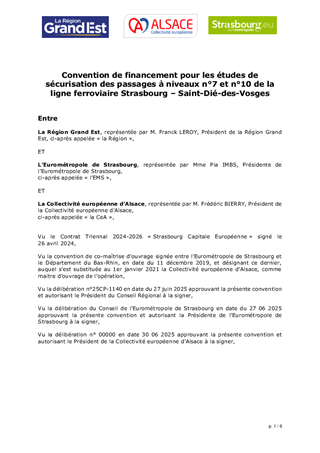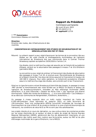 Le présent rapport a pour objet d’approuver les termes de la convention liée aux études sur les voies d'accès et aménagements multimodaux de l'aéroport international de Strasbourg tels que mentionnés dans le Contrat Triennal Strasbourg capitale européenne 2024/2026 à l’article 2.4. Ces études, dont la maîtrise d’ouvrage est assurée par la Collectivité européenne d'Alsace, portent sur la sécurisation des passages à niveaux 7 et 10 à Entzheim (périmètre EMS). La convention a pour objet de préciser le financement des études de sécurisation des passages à niveau 7 et 10, à conclure avec l’Eurométropole de Strasbourg et la Région Grand Est. Ces deux dernières assurent le financement à hauteur de 100 000 € chacune. Pour cette opération, la Collectivité européenne d’Alsace assure la maîtrise d’ouvrage des études, sans prendre part à leur financement.