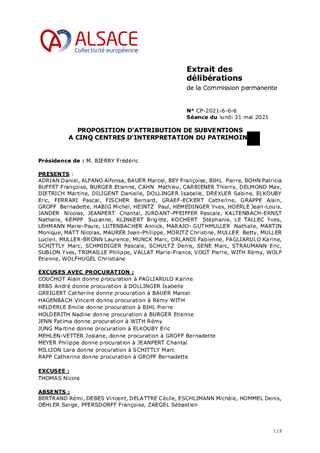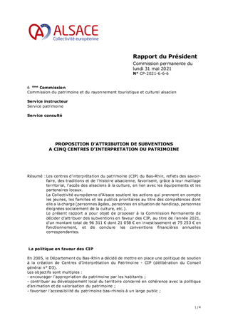 Les centres d'interprétation du patrimoine (CIP) du Bas-Rhin, reflets des savoir-faire, des traditions et de l'histoire alsacienne, favorisent, grâce à leur maillage territorial, l'accès des alsaciens à la culture, en lien avec les équipements et les partenaires locaux. La Collectivité européenne d’Alsace soutient les actions qui prennent en compte les jeunes, les familles et les publics prioritaires au titre des compétences dont elle a la charge (personnes âgées, personnes en situation de handicap, personnes éloignées socialement de la culture, etc.). Le présent rapport a pour objet de proposer à la Commission Permanente de décider d'attribuer des subventions en faveur des CIP, au titre de l'année 2021, d'un montant total de 96 311 € dont 21 058 € en investissement et 75 253 € en fonctionnement, et de conclure les conventions financières annuelles correspondantes.