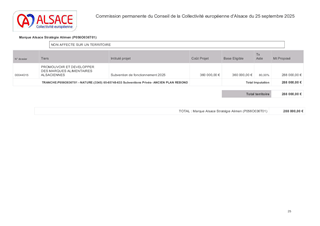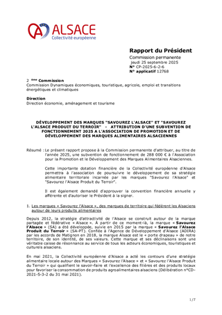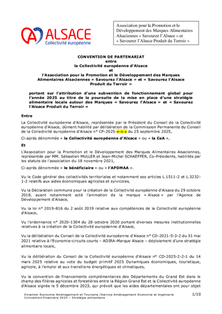 Le présent rapport propose à la Commission permanente d'attribuer, au titre de l'année 2025, une subvention de fonctionnement de 288 000 € à l'Association pour la Promotion et le Développement des Marques Alimentaires Alsaciennes. Cette importante dotation financière de la Collectivité européenne d'Alsace permettra à l'association de poursuivre le développement de sa stratégie alimentaire territoriale incarnée par les marques "Savourez l'Alsace" et "Savourez l'Alsace Produit du Terroir". Il est également demandé d'approuver la convention financière annuelle y afférente et d'autoriser le Président à la signer.