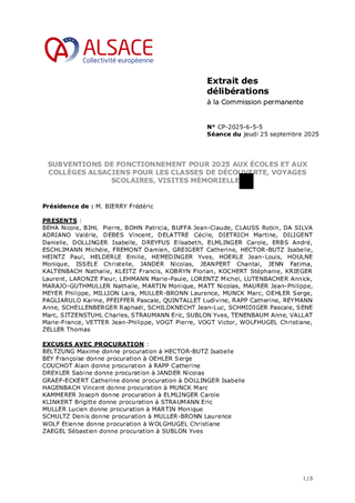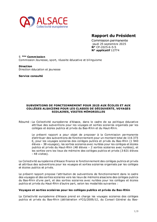 SUBVENTIONS DE FONCTIONNEMENT POUR 2025 AUX ÉCOLES ET AUX COLLÈGES ALSACIENS POUR LES CLASSES DE DÉCOUVERTE, VOYAGES SCOLAIRES, VISITES MÉMORIELLES