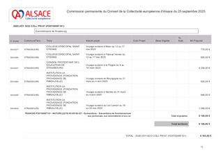 La Collectivité européenne d’Alsace, dans le cadre de sa politique éducative attribue des subventions pour les voyages et sorties scolaires organisés par les collèges et écoles publics et privés du Bas-Rhin et du Haut-Rhin. Le présent rapport a pour objet de proposer à la Commission permanente d’attribuer des subventions de fonctionnement pour un montant total de 116 373 €, pour les voyages scolaires des collèges publics et privés du Bas-Rhin (1 940 élèves – 38 voyages), les sorties scolaires avec nuitées pour les collèges et écoles publics et privés du Haut-Rhin (48 élèves – 2 sorties scolaires avec nuitées), et les sorties vers les lieux de mémoire des collèges publics et privés (3 821 élèves - 48 visites).