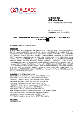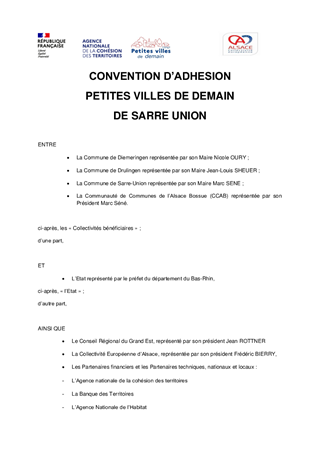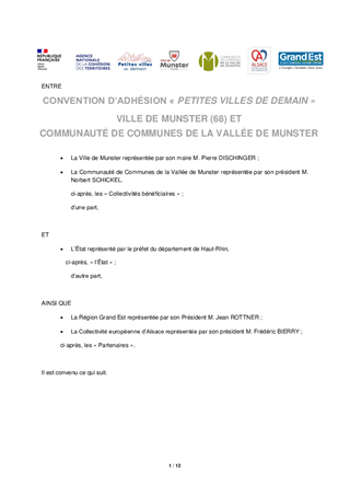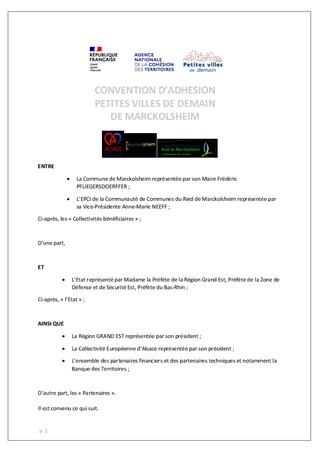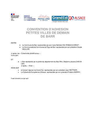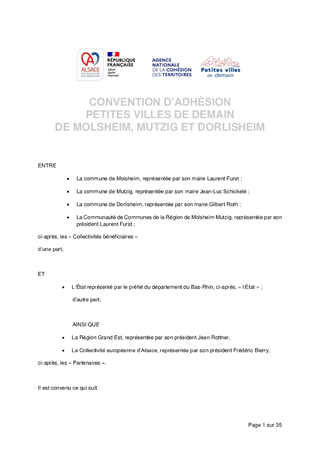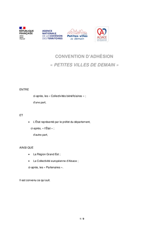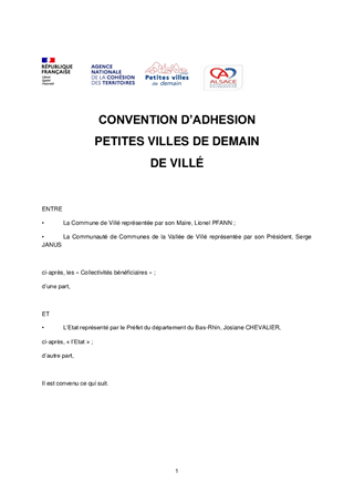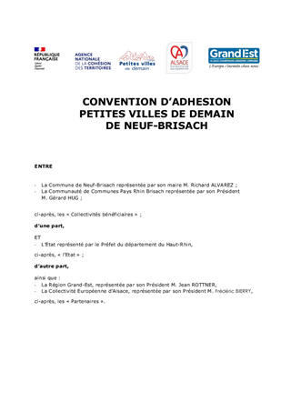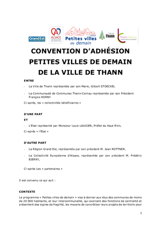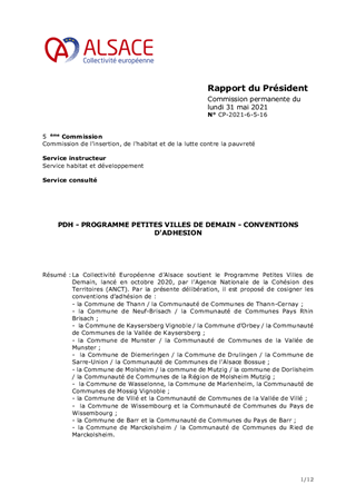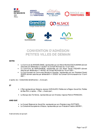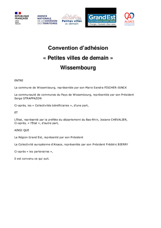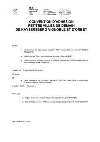 La Collectivité Européenne d’Alsace soutient le Programme Petites Villes de Demain, lancé en octobre 2020, par l’Agence Nationale de la Cohésion des Territoires (ANCT). Par la présente délibération, il est proposé de cosigner les conventions d’adhésion de : - la Commune de Thann / la Communauté de Communes de Thann-Cernay ; - la Commune de Neuf-Brisach / la Communauté de Communes Pays Rhin Brisach ; - la Commune de Kaysersberg Vignoble / la Commune d’Orbey / la Communauté de Communes de la Vallée de Kaysersberg ; - la Commune de Munster / la Communauté de Communes de la Vallée de Munster ; - la Commune de Diemeringen / la Commune de Drulingen / la Commune de Sarre-Union / la Communauté de Communes de l'Alsace Bossue ; - la Commune de Molsheim / la commune de Mutzig / la commune de Dorlisheim / la Communauté de Communes de la Région de Molsheim Mutzig ; - la Commune de Wasselonne, la Commune de Marlenheim, la Communauté de Communes de Mossig Vignoble ; - la Commune de Villé et la Communauté de Communes de la Vallée de Villé ; - la Commune de Wissembourg et la Communauté de Communes du Pays de Wissembourg ; - la Commune de Barr et la Communauté de Communes du Pays de Barr ; - la Commune de Marckolsheim / la Communauté de Communes du Ried de Marckolsheim.