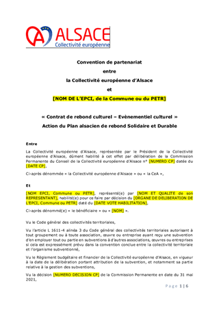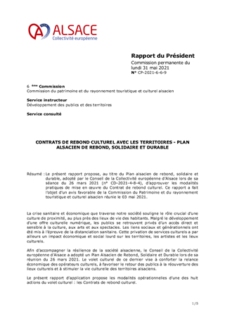 Le présent rapport propose, au titre du Plan alsacien de rebond, solidaire et durable, adopté par le Conseil de la Collectivité européenne d’Alsace lors de sa séance du 26 mars 2021 (n° CD-2021-4-8-4), d’approuver les modalités pratiques de mise en œuvre du Contrat de rebond culturel. Ce rapport a fait l’objet d’un avis favorable de la Commission du Patrimoine et du rayonnement touristique et culturel alsacien réunie le 03 mai 2021.