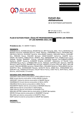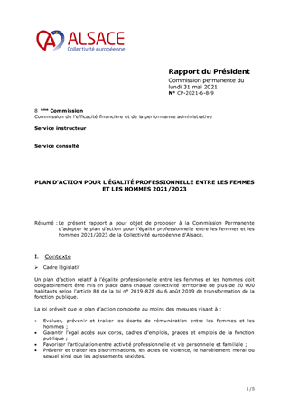 Le présent rapport a pour objet de proposer à la Commission Permanente d’adopter le plan d’action pour l’égalité professionnelle entre les femmes et les hommes 2021/2023 de la Collectivité européenne d’Alsace.