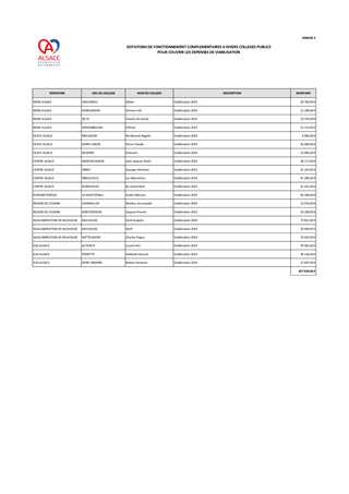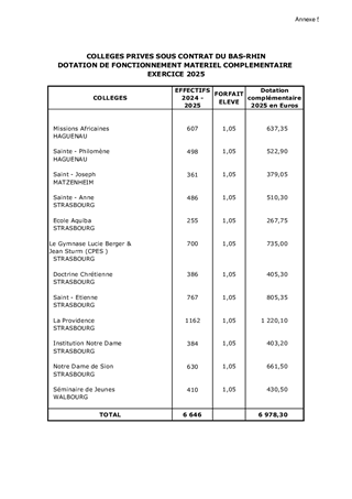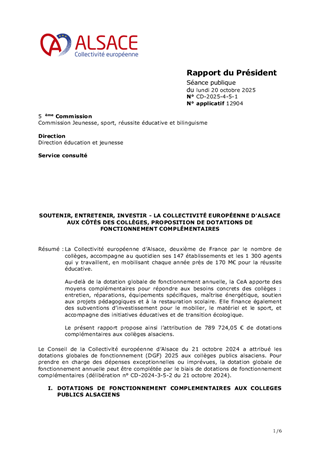 La Collectivité européenne d’Alsace, deuxième de France par le nombre de collèges, accompagne au quotidien ses 147 établissements et les 1 300 agents qui y travaillent, en mobilisant chaque année près de 170 M€ pour la réussite éducative. Au-delà de la dotation globale de fonctionnement annuelle, la CeA apporte des moyens complémentaires pour répondre aux besoins concrets des collèges : entretien, réparations, équipements spécifiques, maîtrise énergétique, soutien aux projets pédagogiques et à la restauration scolaire. Elle finance également des subventions d’investissement pour le mobilier, le matériel et le sport, et accompagne des initiatives éducatives et de transition écologique. Le présent rapport propose ainsi l’attribution de 789 724,05 € de dotations complémentaires aux collèges alsaciens.