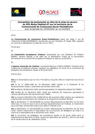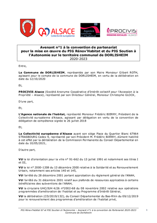 Le présent rapport a pour objet de proposer à la Commission Permanente d’approuver la conclusion d'une convention de partenariat avec la Communauté de Communes Sauer Pechelbronn et un avenant à une convention de partenariat conclue avec la Commune de Dorlisheim au titre de la mise en œuvre des Programmes d’Intérêt Généraux Rénov’Habitat 67 et Soutien à l’Autonomie.