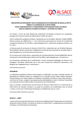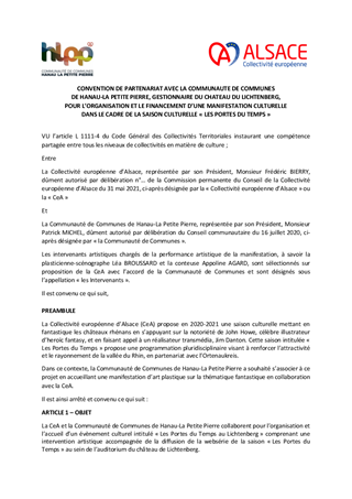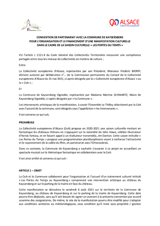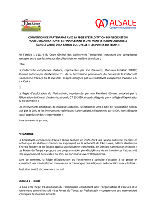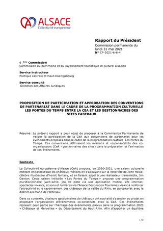 Le présent rapport a pour objet de proposer à la Commission Permanente de valider la participation de la CeA aux conventions de partenariat pour les événements proposés dans le cadre de la programmation castrale Les Portes du Temps. Ces conventions définissent les missions et responsabilités des co-organisateurs (CeA - gestionnaires des sites) dans la préparation et l'animation de ces événements.