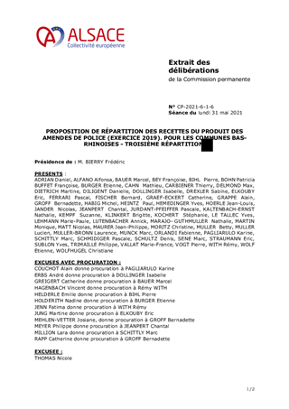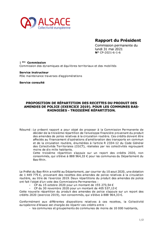 PROPOSITION DE RÉPARTITION DES RECETTES DU PRODUIT DES AMENDES DE POLICE (EXERCICE 2019). POUR LES COMMUNES BAS-RHINOISES - TROISIÈME RÉPARTITION.