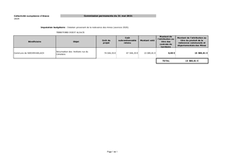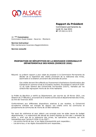 Le présent rapport a pour objet de proposer à la Commission Permanente de décider de la répartition des crédits provenant de la redevance des mines, assimilable à la dotation provenant des amendes de police. Ces crédits doivent être affectés au financement d'opérations d'amélioration des transports en commun et de la circulation routière, énumérées à l'article R 2334-12 du Code Général des Collectivités Territoriales (CGCT), réalisées par les collectivités regroupant moins de dix mille habitants.