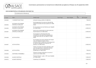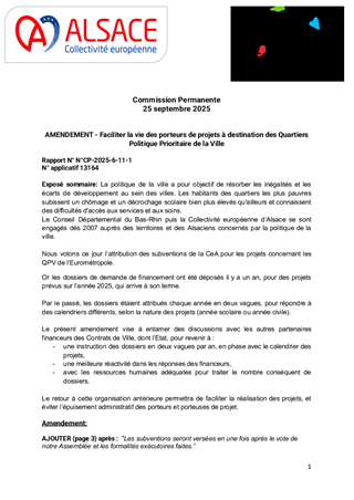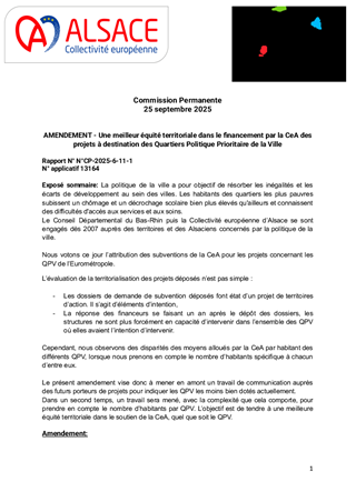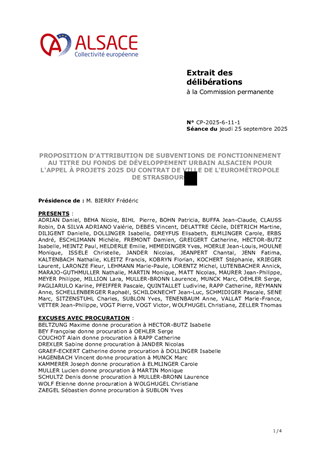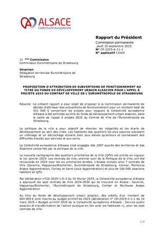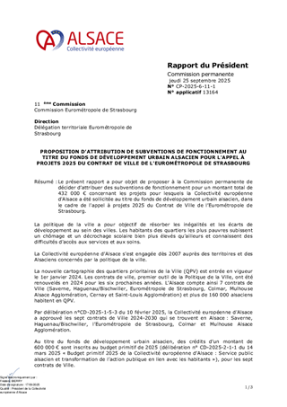 Le présent rapport a pour objet de proposer à la Commission permanente de décider d’attribuer des subventions de fonctionnement pour un montant total de 432 000 € concernant les projets pour lesquels la Collectivité européenne d'Alsace a été sollicitée au titre du fonds de développement urbain alsacien, dans le cadre de l'appel à projets 2025 du Contrat de Ville de l’Eurométropole de Strasbourg.