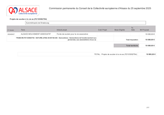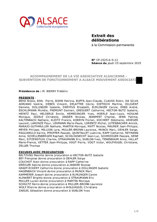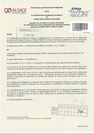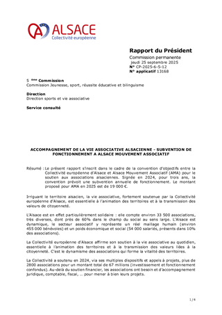 Le présent rapport s’inscrit dans le cadre de la convention d’objectifs entre la Collectivité européenne d’Alsace et Alsace Mouvement Associatif (AMA) pour le soutien aux associations alsaciennes. Signée en 2024, pour trois ans, la convention prévoit une subvention annuelle de fonctionnement. Le montant proposé pour AMA en 2025 est de 19 000 €.