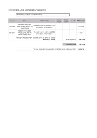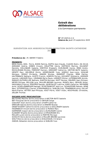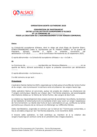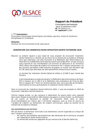 Le présent rapport a pour objet de vous proposer de renouveler l’opération Sainte-Catherine à l’échelle du territoire de la Collectivité européenne d’Alsace ainsi que d'attribuer une aide financière à la Fédération des Arboriculteurs du Haut-Rhin et la Fédération de Producteurs de Fruits du Bas-Rhin. Un jeu concours sera organisé et une manifestation par territoire se déroulera le 22 novembre 2025, autour de projets de création ou d’extension de 7 vergers communaux. Ce jeu concours permettra à 385 alsaciens de gagner un fruitier soit 259 demi tige et 126 haute tige distribués par des associations d’arboriculture locales. Le montant de l’opération Sainte-Catherine s’élève à 15 000 € pour l’achat des fruitiers. Il est proposé dans ce cadre de soutenir la Fédération des Arboriculteurs du Haut-Rhin à hauteur de 11 305 € et la Fédération des producteurs de fruits du Bas-Rhin à hauteur de 7 422 € en fonctionnement pour leurs activités de formation, d’animations et leurs participations à l’opération Sainte-Catherine.