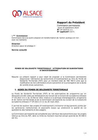 Le présent rapport a pour objet de proposer à la Commission permanente d'approuver l'attribution de subventions d'investissement au titre du Fonds de Solidarité Territoriale (FST) pour un montant total de 760 789 € ainsi que la modification du tiers attributaire d’une subvention et la prolongation de la durée de validité d’une subvention.