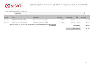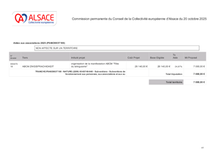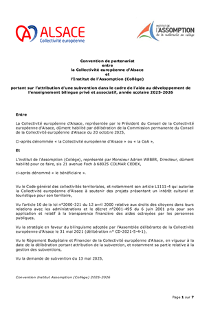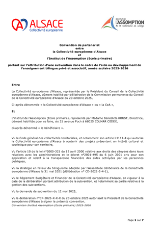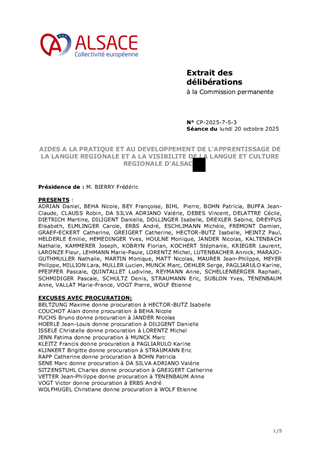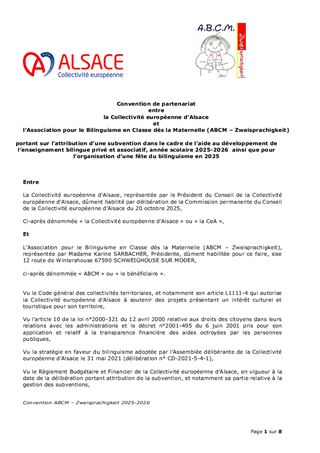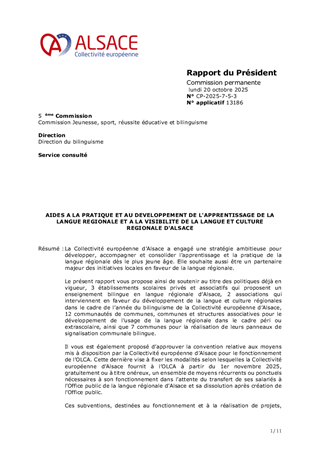 La Collectivité européenne d’Alsace a engagé une stratégie ambitieuse pour développer, accompagner et consolider l’apprentissage et la pratique de la langue régionale dès le plus jeune âge. Elle souhaite aussi être un partenaire majeur des initiatives locales en faveur de la langue régionale. Le présent rapport vous propose ainsi de soutenir au titre des politiques déjà en vigueur, 3 établissements scolaires privés et associatifs qui proposent un enseignement bilingue en langue régionale d’Alsace, 2 associations qui interviennent en faveur du développement de la langue et culture régionales dans le cadre de l’année du bilinguisme de la Collectivité européenne d’Alsace, 12 communautés de communes, communes et structures associatives pour le développement de l’usage de la langue régionale dans le cadre péri ou extrascolaire, ainsi que 7 communes pour la réalisation de leurs panneaux de signalisation communale bilingue. Il vous est également proposé d’approuver la convention relative aux moyens mis à disposition par la Collectivité européenne d’Alsace pour le fonctionnement de l’OLCA. Cette dernière vise à fixer les modalités selon lesquelles la Collectivité européenne d’Alsace fournit à l’OLCA à partir du 1er novembre 2025, gratuitement ou à titre onéreux, un ensemble de moyens récurrents ou ponctuels nécessaires à son fonctionnement dans l’attente du transfert de ses salariés à l’Office public de la langue régionale d’Alsace et sa dissolution après création de l’Office public. Ces subventions, destinées au fonctionnement et à la réalisation de projets, représentent au total 705 556 € dont 692 521 € en fonctionnement ; 650 000 € affectés à 3 établissements scolaires privés et associatifs, 9 500 € à 2 associations, 7 000 € à la commune de Guebwiller pour l’organisation de son festival Biling’oh, 26 021 € dans le cadre du dispositif « mittwuch uff elssassich » et 13 035 € en investissement destinés à 7 communes pour la réalisation de leurs panneaux de signalisation communale bilingue. Il vous est donc proposé d’approuver l'attribution de ces subventions de fonctionnement et d’investissement, ainsi que les 4 conventions de partenariat à conclure entre la Collectivité européenne d’Alsace et les établissements scolaires privés et associatifs (ABCM Zweisprachigkeit, Ecole Sainte Geneviève et Institut de l’Assomption [Ecole et Collège]) dans le cadre de l’aide au développement de l’enseignement bilingue privé et associatif, au titre de l’année scolaire 2025-2026 et la convention de moyens à conclure entre la Collectivité européenne d’Alsace et l’OLCA.