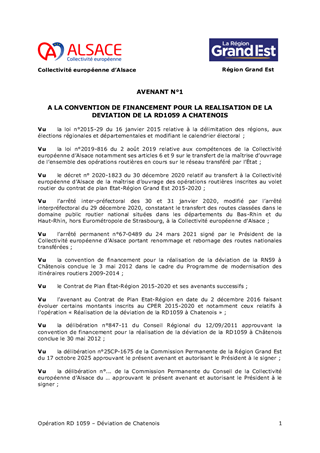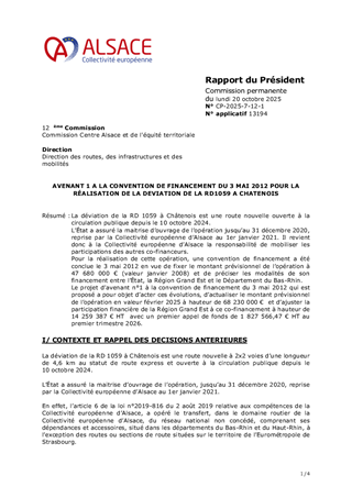 La déviation de la RD 1059 à Châtenois est une route nouvelle ouverte à la circulation publique depuis le 10 octobre 2024. L’État a assuré la maitrise d’ouvrage de l’opération jusqu’au 31 décembre 2020, reprise par la Collectivité européenne d’Alsace au 1er janvier 2021. Il revient donc à la Collectivité européenne d’Alsace la responsabilité de mobiliser les participations des autres co-financeurs. Pour la réalisation de cette opération, une convention de financement a été conclue le 3 mai 2012 en vue de fixer le montant prévisionnel de l’opération à 47 680 000 € (valeur janvier 2008) et de préciser les modalités de son financement entre l’État, la Région Grand Est et le Département du Bas-Rhin. Le projet d’avenant n°1 à la convention de financement du 3 mai 2012 qui est proposé a pour objet d’acter ces évolutions, d’actualiser le montant prévisionnel de l’opération en valeur février 2025 à hauteur de 68 230 000 € et d’ajuster la participation financière de la Région Grand Est à ce co-financement à hauteur de 14 259 387 € HT avec un premier appel de fonds de 1 827 566,47 € HT au premier trimestre 2026.