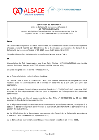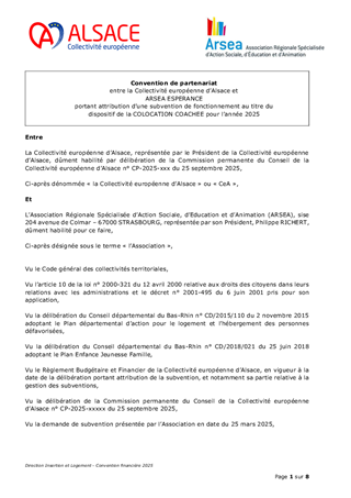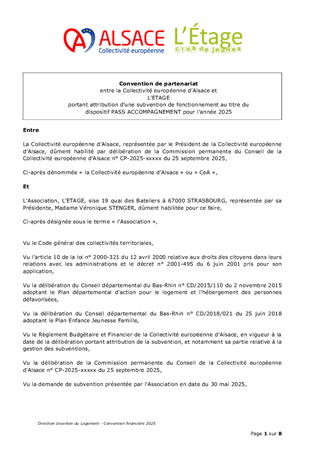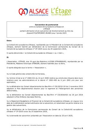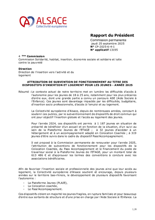 Le contexte actuel de notre territoire met en lumière les difficultés d’accès à l’autonomie pour les jeunes de 18 à 25 ans, notamment pour les plus précaires d’entre eux, dont une grande partie a connu un parcours ASE (Aide Sociale à l'Enfance). Ces jeunes sont davantage impactés par les difficultés, budgétaire, d’insertion socio professionnelle, d’accès à l’emploi et au logement. La Collectivité européenne d'Alsace, depuis de nombreuses années, concourt à soutenir ces publics, par le subventionnement de dispositifs de droit commun qui ont pour objectif l’insertion globale et l’accès au logement des jeunes. Pour l’année 2024, ces dispositifs ont permis à 1 187 jeunes en situation de précarité de bénéficier d’un accueil et en fonction de la situation, d’un suivi au sein de la Plateforme Jeunes de l’ETAGE ; à 32 jeunes d’accéder à un hébergement et à un accompagnement adapté en Colocation Coachée ; à 319 jeunes d'être suivis dans le cadre du dispositif Pass'Accompagnement. Il est proposé à la Commission permanente de renouveler pour l'année 2025, l’attribution de subventions de fonctionnement pour les dispositifs de la Colocation Coachée, du Pass Accompagnement et le financement du poste de travailleur social à la Plateforme Jeunes de l’ETAGE, pour un montant total de 613 486 € et d’approuver les termes des conventions à conclure avec les associations bénéficiaires.