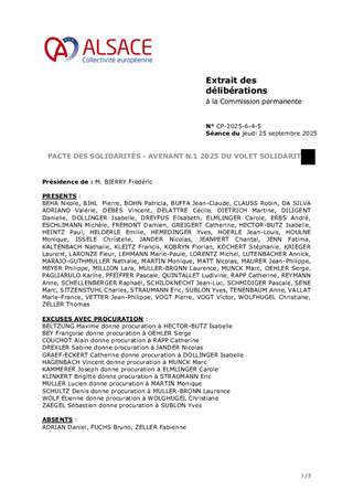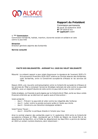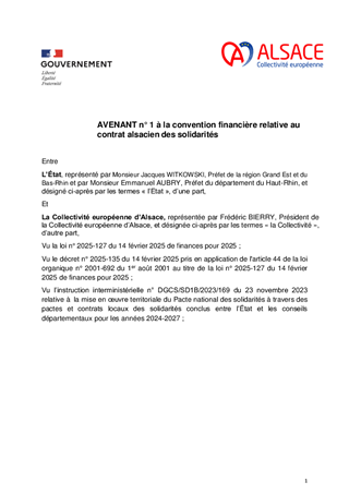 Le présent rapport a pour objet d'approuver la signature de l'avenant 2025 n°1 à la convention financière 2024-2027 relative au Contrat alsacien des Solidarités, volet Solidarités, entre la Collectivité européenne d'Alsace et les services de l'Etat.