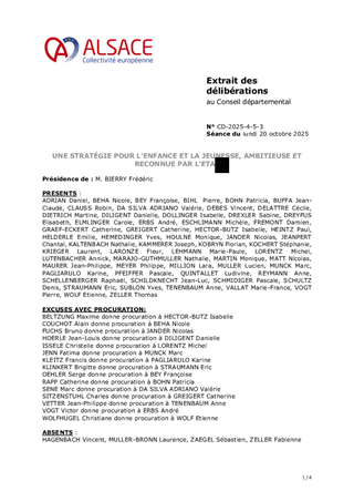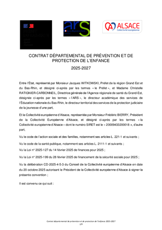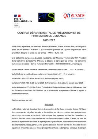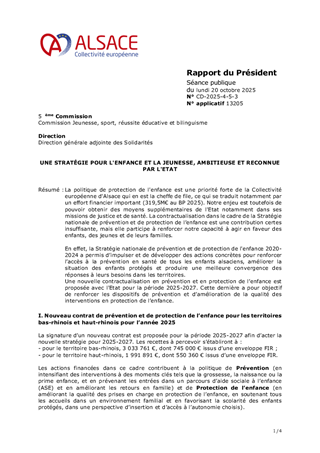La politique de protection de l'enfance est une priorité forte de la Collectivité européenne d'Alsace qui en est la cheffe de file, ce qui se traduit notamment par un effort financier important (319,5M€ au BP 2025). Notre enjeu est toutefois de pouvoir obtenir des moyens supplémentaires de l'Etat notamment dans ses missions de justice et de santé. La contractualisation dans le cadre de la Stratégie nationale de prévention et de protection de l’enfance est une contribution certes insuffisante, mais elle participe à renforcer notre capacité à agir en faveur des enfants, des jeunes et de leurs familles. En effet, la Stratégie nationale de prévention et de protection de l'enfance 2020-2024 a permis d’impulser et de développer des actions concrètes pour renforcer l’accès à la prévention en santé de tous les enfants alsaciens, améliorer la situation des enfants protégés et produire une meilleure convergence des réponses à leurs besoins dans les territoires. Une nouvelle contractualisation en prévention et en protection de l’enfance est proposée avec l'Etat pour la période 2025-2027. Cette dernière a pour objectif de renforcer les dispositifs de prévention et d’amélioration de la qualité des interventions en protection de l’enfance.
