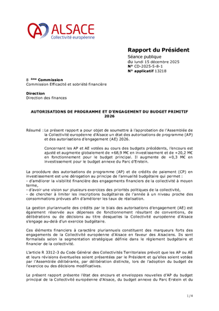 Le présent rapport a pour objet de soumettre à l’approbation de l’Assemblée de la Collectivité européenne d’Alsace un état des autorisations de programme (AP) et des autorisations d’engagement (AE) 2026. Concernant les AP et AE votées au cours des budgets précédents, l’encours est ajusté et augmente globalement de +68,9 M€ en investissement et de +20,2 M€ en fonctionnement pour le budget principal. Il augmente de +0,3 M€ en investissement pour le budget annexe du Parc d’Erstein.