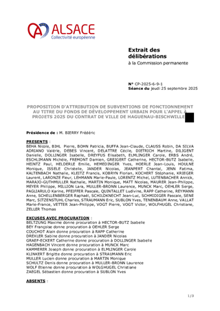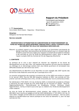 Le présent rapport a pour objet de proposer à la Commission permanente de décider d’attribuer des subventions de fonctionnement pour un montant total de 35 000 € concernant les projets pour lesquels la Collectivité européenne d'Alsace a été sollicitée au titre du fonds de développement urbain, dans le cadre de l'appel à projets 2025 du Contrat de Ville de Haguenau-Bischwiller