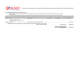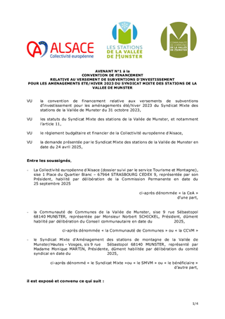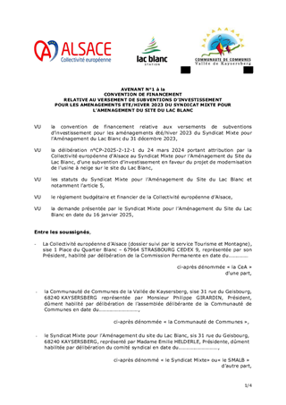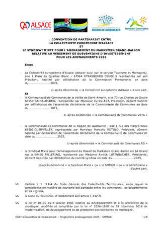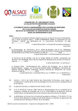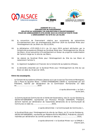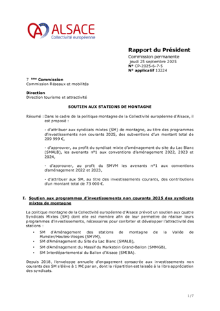 Dans le cadre de la politique montagne de la Collectivité européenne d'Alsace, il est proposé : - d'attribuer aux syndicats mixtes (SM) de montagne, au titre des programmes d’investissements non courants 2025, des subventions d’un montant total de 209 999 €, - d’approuver, au profit du syndicat mixte d’aménagement du site du Lac Blanc (SMALB), les avenants n°1 aux conventions d’aménagement 2022, 2023 et 2024, - d’approuver, au profit du SMVM les avenants n°1 aux conventions d’aménagement 2022 et 2023, - d’attribuer aux SM, au titre des investissements courants, des contributions d’un montant total de 73 000 €.