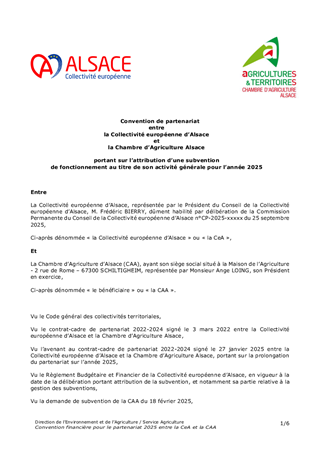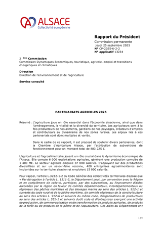 L’agriculture joue un rôle essentiel dans l’économie alsacienne, ainsi que dans l’aménagement, la vitalité et la diversité du territoire. Les agriculteurs sont à la fois producteurs de nos aliments, gardiens de nos paysages, créateurs d’emplois et contributeurs au dynamisme de nos zones rurales. Les enjeux liés à ces partenariats sont donc multiples et variés. Dans le cadre de ce rapport, il est proposé de soutenir divers partenaires, dont la Chambre d'Agriculture Alsace, par l'attribution de subventions de fonctionnement pour un montant total de 883 225 €.