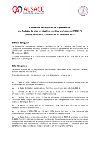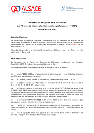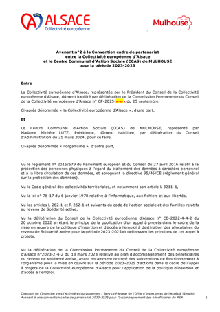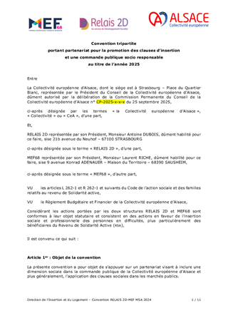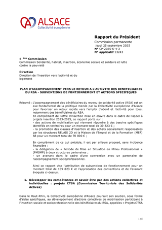L’accompagnement des bénéficiaires du revenu de solidarité active (RSA) est un axe fondamental de la politique menée par la Collectivité européenne d’Alsace pour favoriser un retour rapide vers l’emploi d’abord et l’activité pour tous, notamment des bénéficiaires du RSA. En complément de l’offre d’insertion mise en œuvre dans le cadre de l’appel à projets insertion 2023-2025, ce rapport porte sur : - des actions de mobilisation qui viennent répondre à des besoins spécifiques identifiés en territoires pour un montant total de 39 823 € ; - la promotion des clauses d’insertion et des achats socialement responsables par les structures RELAIS 2D et la Maison de l’Emploi et de la Formation (MEF) 68 pour un montant total de 70 000 € ; En complément de ce qui précède, il est par ailleurs proposé, sans incidence financière : - la délégation de « Période de Mise en Situation en Milieu Professionnel » (PMSMP) à deux structures partenaires ; - un avenant dans le cadre d’une convention avec un partenaire de l’accompagnement socioprofessionnel. Ainsi ce rapport vise l’attribution de subventions de fonctionnement pour un montant total de 109 823 € et l’approbation des conventions et de l’avenant évoqués ci-dessus.