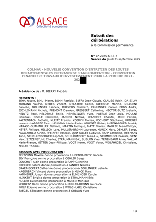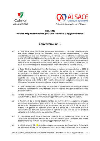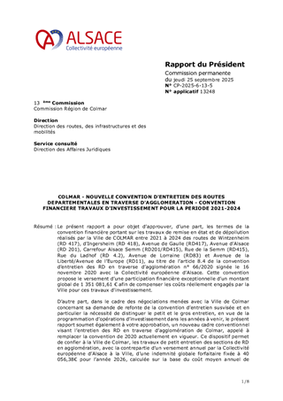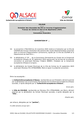 Le présent rapport a pour objet d’approuver, d’une part, les termes de la convention financière portant sur les travaux de remise en état et de dépollution réalisés par la Ville de COLMAR entre 2021 à 2024 des routes de Wintzenheim (RD 417), d’Ingersheim (RD 418), Avenue de Gaulle (RD417), Avenue d’Alsace (RD 201), Carrefour Alsace Semm (RD201/RD415), Rue de la Semm (RD415), Rue du Ladhof (RD 4.2), Avenue de Lorraine (RD83) et Avenue de la Liberté/Avenue de l’Europe (RD11), au titre de l’article 8.4 de la convention d’entretien des RD en traverse d’agglomération n° 66/2020 signée le 16 novembre 2020 avec la Collectivité européenne d’Alsace. Cette convention propose le versement d’une participation financière exceptionnelle d’un montant global de 1 351 081,61 € afin de compenser les coûts réellement engagés par la Ville pour ces travaux d'investissement. D’autre part, dans le cadre des négociations menées avec la Ville de Colmar concernant sa demande de refonte de la convention d’entretien susvisée et en particulier la nécessité de distinguer le petit et le gros entretien, en vue de la programmation d’opérations d’investissement dans les années à venir, le présent rapport soumet également à votre approbation, un nouveau cadre conventionnel visant l’entretien des RD en traverse d’agglomération de Colmar, appelé à remplacer la convention de 2020 actuellement en vigueur. Ce dispositif permet de confier à la Ville de Colmar, les travaux de petit entretien des sections de RD en agglomération, avec la contrepartie d’un versement annuel par la Collectivité européenne d’Alsace à la Ville, d’une indemnité globale forfaitaire fixée à 40 056,38€ pour l’année 2026, calculée sur la base du coût moyen annuel de l’entretien courant d’une RD en agglomération. S’agissant des opérations de gros entretien des traverses, il renvoie à la conclusion, chaque année, d’une convention spécifique de transfert temporaire de maîtrise d’ouvrage et de financement, à établir à l’appui d’une programmation annuelle de travaux d’investissement définie préalablement et de manière concertée entre les parties, à entériner par les assemblées délibérantes respectives. Enfin, le présent rapport propose la résiliation par anticipation d'une année de la convention d’entretien du 16 novembre 2020 conclue avec la Ville de Colmar, soit à la date du 31 décembre 2025 au lieu de l'échéance théorique du 31 décembre 2026, afin d’accueillir la mise en place du nouveau dispositif dès le 1er janvier 2026.