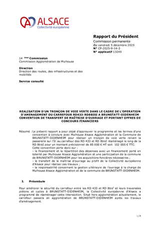 Le présent rapport a pour objet d’approuver le programme et les termes d’une convention à conclure avec Mulhouse Alsace Agglomération et la Commune de BRUNSTATT-DIDENHEIM pour réaliser un tronçon de voie verte reliant la passerelle sur l’Ill au carrefour des RD 433 et RD 8bisI réaménagé le long de la RD 8bisI pour un montant prévisionnel de 85 000 € HT soit 102 000 € TTC. Cette convention porte donc sur : - le financement et la répartition des dépenses avec un financement porté en totalité par Mulhouse Alsace Agglomération et une participation de la commune de BRUNSTATT-DIDENHEIM pour les acquisitions foncières nécessaires ; - le transfert de la maîtrise d’ouvrage au profit de la Collectivité européenne d’Alsace pour réaliser ces travaux ; - la responsabilité concernant la gestion ultérieure de l’ouvrage à la charge de Mulhouse Alsace Agglomération et de la commune de BRUNSTATT-DIDENHEIM.