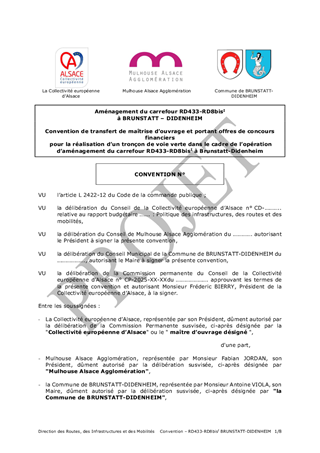REALISATION D'UN TRONÇON DE VOIE VERTE DANS LE CADRE DE L'OPERATION D'AMENAGEMENT DU CARREFOUR RD433-RD8BISI A BRUNSTATT-DIDENHEIM CONVENTION DE TRANSFERT DE MAÎTRISE D'OUVRAGE ET PORTANT OFFRES DE CONCOURS FINANCIERS