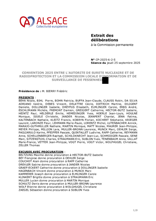 L’État, via l’Autorité de Sûreté Nucléaire et de Radioprotection (ASNR), apporte un concours financier à la Commission Locale d'Information et de Surveillance (CLIS) du Centre de Production d'Electricité de FESSENHEIM afin qu'elle assure sa mission de suivi, d'information et de concertation en matière de sûreté nucléaire, de radioprotection et d'impact des activités nucléaires sur les personnes et l'environnement. Ce rapport vous propose d'approuver la convention 2025 entre la CLIS et l'ASNR et d'acter l'encaissement d'une recette de 28 000 €.