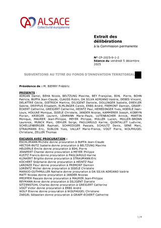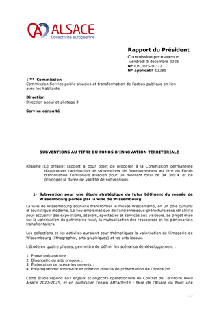 Le présent rapport a pour objet de proposer à la Commission permanente d’approuver l’attribution de subventions de fonctionnement au titre du Fonds d’Innovation Territoriale alsacien pour un montant total de 34 309 € et de prolonger la durée de validité de subventions.
