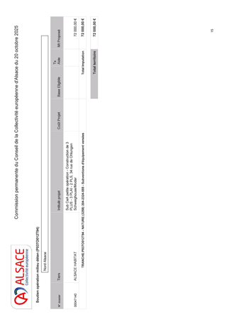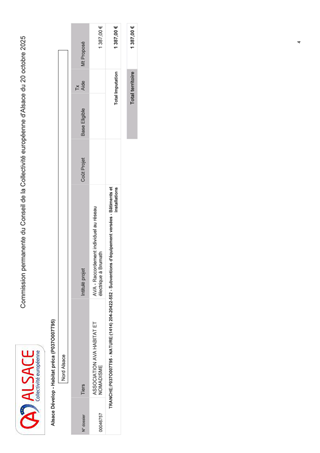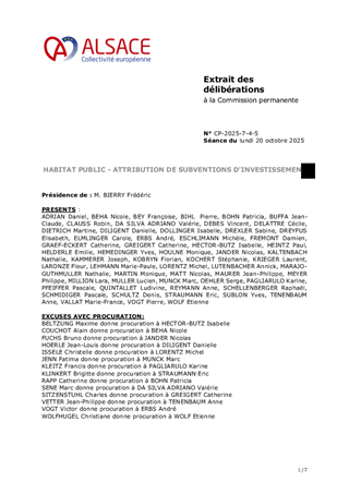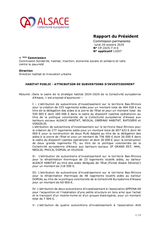 Dans le cadre de la stratégie habitat 2024-2029 de la Collectivité européenne d'Alsace, il est proposé d'approuver : I – L’attribution de subventions d’investissement sur le territoire Bas-Rhinois pour la création de 155 logements aidés pour un montant total de 464 928 € au titre de la délégation des aides à la pierre de l’Etat et pour un montant total de 530 000 € dont 180 000 € dans le cadre du dispositif «petites opérations» au titre de la politique volontariste de la Collectivité européenne d’Alsace aux bailleurs sociaux ALSACE HABITAT, NEOLIA, OBERNAI HABITAT, BATIGERE et VOSGELIS. L’attribution de subventions d’investissement sur le territoire Haut-Rhinois pour la création de 277 logements aidés pour un montant total de 857 632 € dont 40 000 € pour la construction de deux PLAI Adapté au titre de la délégation des aides à la pierre de l’Etat et pour un montant de 756 000 € dont 36 000 € dans le cadre du dispositif «petites opérations» et dont 20 000 € pour la construction de deux grands logements T5, au titre de la politique volontariste de la Collectivité européenne d’Alsace aux bailleurs sociaux 3F GRAND EST, HHA, NEOLIA, PHCCA, DOMIAL et VILOGIA. II- L’attribution de subventions d’investissement sur le territoire Bas-Rhinois pour la réhabilitation thermique de 23 logements locatifs aidés, au bailleur ALSACE HABITAT au titre des aides délégués de l’Etat (Fonds Alsace Dévelop’) pour un montant de 218 500 €. III- L’attribution de subventions d’investissement sur le territoire Bas-Rhinois pour la réhabilitation thermique de 48 logements locatifs aidés au bailleur DOMIAL au titre de la politique volontariste de la Collectivité Européenne d’Alsace pour un montant de 60 000 €. IV- L'attribution de deux subventions d’investissement à l’association APPONA 68 pour l’acquisition et l’installation d’une petite structure en bois ainsi que l’achat et le transport d’un mobile-home et d’un groupe électrogène, pour un montant total de 7 000 €. V- L'attribution de quatre subventions d’investissement à l’association AVA Habitat et Nomadisme pour la réhabilitation de deux salles de bains, le branchement d’une maison aux réseaux d’eau et d’assainissement et la réalisation d’un raccordement individuel au réseau d’électricité, pour un montant de total de 11 999,50 €.
