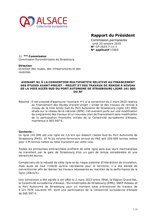 Il est proposé d’approuver l’avenant n°1 à la convention du 2 mars 2023 relative au financement des études d’avant-projet / projet et des travaux de remise à niveau de la Voie Accès Sud du Port Autonome de Strasbourg (ligne 141 000) située sur le réseau ferré national (RFN). Cet avenant porte sur une modification du programme des travaux et un nouveau plan de financement sans modification de la participation financière initiale de la Collectivité européenne d’Alsace, maintenue à 565 997 €.
